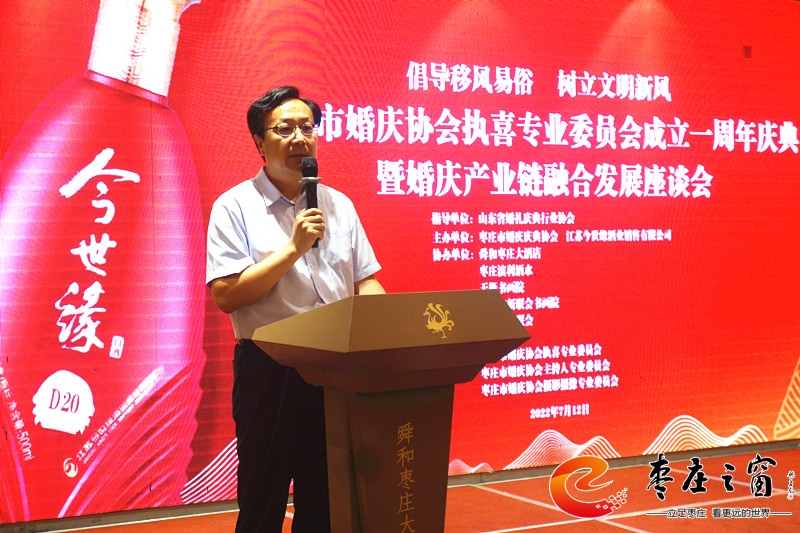 為貫徹落實上級部門提出的倡導(dǎo)文明、喜事新辦,移風(fēng)易俗,減少陋習(xí),新事簡辦的工作方針,建立健全婚禮執(zhí)喜的有序化,更好的構(gòu)建和諧社會,為“工業(yè)強(qiáng)市、產(chǎn)業(yè)興市”做貢獻(xiàn)。7月12日下午,由棗莊市婚慶慶典協(xié)會、江蘇今世緣酒業(yè)銷售有限公司主辦的棗莊市婚慶慶典協(xié)會執(zhí)喜專業(yè)委員會成立一周年慶典暨婚慶產(chǎn)業(yè)鏈融合發(fā)展座談會在舜和棗莊大酒店舉辦,執(zhí)喜專委會成員、專委會顧問團(tuán)成員、棗莊婚慶界、餐飲界、商業(yè)界代表60余人參加活動。