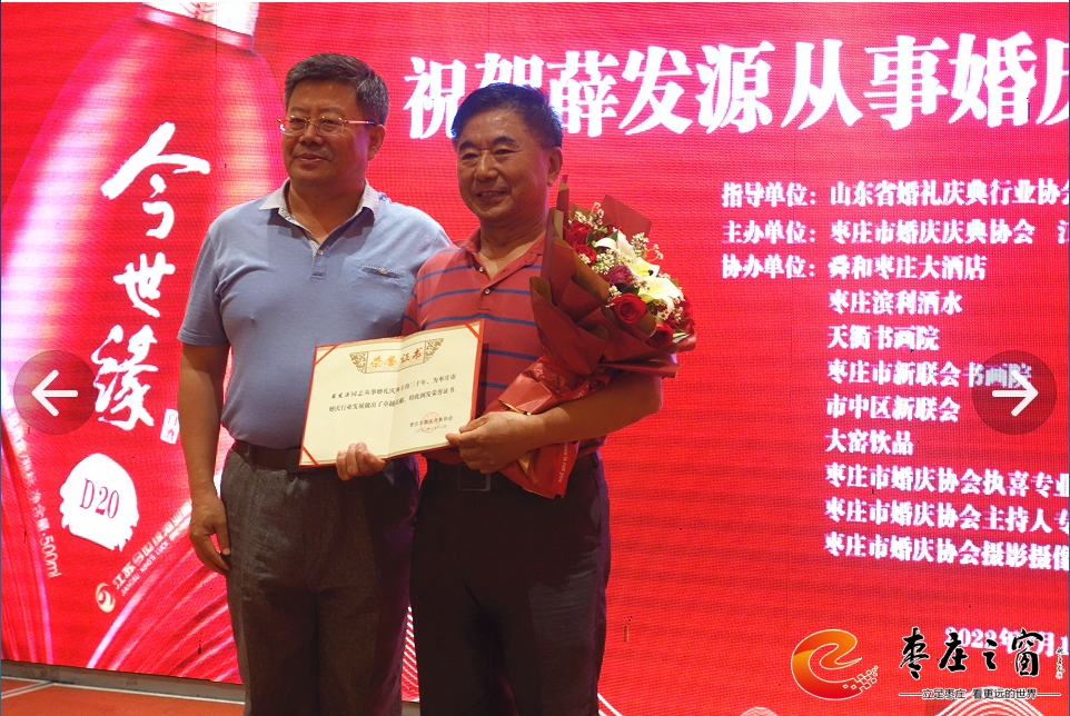 在專委會成立一周年之際,為了更好地開展工作,棗莊市婚慶慶典協(xié)會特舉辦專委會成立1周年慶典暨婚慶產(chǎn)業(yè)鏈融合發(fā)展座談會。原棗莊市兩新組織黨工委副書記、市民政局一級調(diào)研員叢方佐在座談會上致賀詞,山東省婚禮慶典行業(yè)協(xié)會、棗莊市婚慶慶典協(xié)會、江蘇今世緣酒業(yè)銷售有限公司、舜和棗莊大酒店、棗莊濱利酒水、天衢書畫院、棗莊市新聯(lián)會書畫院、市中區(qū)新聯(lián)會、大窯飲品、棗莊市婚慶協(xié)會執(zhí)喜專業(yè)委員會、棗莊市婚慶協(xié)會主持人專業(yè)委員會、棗莊市婚慶協(xié)會攝影攝像專業(yè)委員會等代表在座談會發(fā)言,對棗莊婚慶行業(yè)與相關(guān)婚慶產(chǎn)業(yè)的融合發(fā)展提出建議和期望。周年慶還給從事婚慶行業(yè)三十周年的薛發(fā)源同志頒發(fā)卓越成就獎,同時,專委會專家顧問團(tuán)新聘任7位同志為執(zhí)喜專業(yè)委員會顧問,進(jìn)一步提高了專委會的專業(yè)水平,在今后為廣大群眾提供更好的專業(yè)化服務(wù)。(楊仁成 攝影)